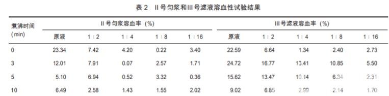 新鮮兔血脫纖維抗凝,配成 2%兔紅細胞混懸液。取 4 種不同煮沸時長的Ⅱ號勻 漿和Ⅲ號濾液各 0.5 mL,加入 48 孔聚苯乙烯血凝板 為第 1 孔,從第 2 孔起用生理鹽水倍比稀釋,然后每 孔加入等量 0.5 mL 2%兔紅細胞懸液,混勻,每個濃 度做 2 個平行孔,并設陰性對照 (生理鹽水 + 2%兔 紅細胞懸液) 和陽性對照 (蒸餾水+2%兔紅細胞懸 液)。于 37 ℃恒溫孵箱中靜置,每隔 0.5 h 觀察紅細 胞溶解情況,觀察 4 h。4 h 后,1 500 r/min 離心 10 min,取上清液,575 nm 處測定吸光度 (OD),計 算溶血率。溶 血 率 (%) = [(ODt-ODn )c / (ODpcODn )c ] ×100%。式中,ODt 為試驗管吸光度,ODnc 為陰性對照管吸光度,ODpc 為陽性對照管吸光度。溶 血率>5%為溶血。