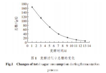 茶酒發酵過程中總糖的變化如圖 1。 從圖 1 可以知道,在發酵初期,由于酵母菌大量生長繁殖的需要,對糖的利用率很高,導致降糖速度非 常快。隨著發酵的進行,降糖速度變慢,主要是由于酒 精含量和酸度的不斷增加,均會在一定程度上影響釀 酒酵母的代謝活動能力,從而降低了糖的消耗速度。 直到總糖不再變化時,發酵也幾乎停止,到主發酵結 束時總糖含量為 7.5 g/L。