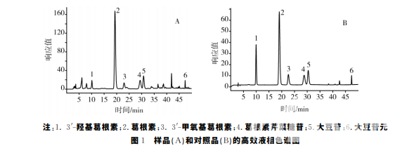 以50%甲醇制備 3′-羥基葛根素0.080mg/mL、葛根素0.16mg/mL、 3′-甲氧 基 葛 根 素 0.040 mg/mL、葛 根 素 芹 菜 糖 苷 0.040mg/mL、大 豆 苷 0.040 mg/mL、大 豆 苷 元 0.005mg/mL混合溶液,即得。