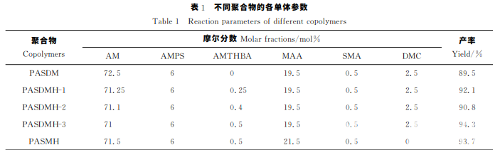 本實驗采 用 自 由 基 膠 束 共 聚 法,將一 定 量 的 AM、AMPS溶解在蒸餾水中,混合加入 MAA,以及提 前溶解在乙 醇 中 的 定 量 AMTHBA、SMA 以及 DMC。 充分攪拌混合溶液,通過滴加1mol/L 的 NaOH 將溶 液pH 調節至7。向溶液中加入SDS,使未溶解的疏水 單體溶解于SDS的增溶膠束中。控制單體總固含量為 10 %,混合溶劑乙醇和水的質量比為1∶10。將混 合 溶液加入裝 有 攪 拌 裝 置 的 三 口 瓶 中,恒 溫 反 應。通 過 注射器將偶氮二異丁基脒鹽酸鹽(AINA)注入三口瓶, 70 ℃條件 下 反 應5h后結 束。向產物中加入無水乙 醇,充分攪拌至 析 出 沉 淀,反復浸泡并洗滌沉淀物,烘 干即得到聚 合 物 PASDMH。利 用相同的反應工藝制 備一系列不同辣素含量以及 不 含 DMC 單體 的 疏 水 締 合聚合物,并測試它們的化學性能。疏水締合聚合物的單體組成比例詳見表1。