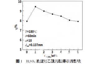 在溫度為 180℃、反應時間為 60min、液固比為 10∶1、原料平均粒徑為 0.137mm 的條件下,H2SO4 濃 度對乙酰丙酸得率的影響見圖 1。