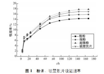 在溫度 25 ℃、相對(duì)濕度 75%下,測(cè)定粗 粉、細(xì)粉、超微粉、破壁飲片吸濕速率,平行 3 份,取以 平均值,結(jié)果見(jiàn)圖 1。由圖可知,3 種不同粒徑粉體吸濕速 率隨著粒徑減小而遞增,以超微粉吸濕速率、吸濕量最大, 在 120 h 接近吸濕平衡,140 h 達(dá)到吸濕平衡; 細(xì)粉 110 h 接近吸濕平衡,120 h 達(dá)到吸濕平衡; 粗粉 100 h 接近吸濕 平衡,120 h 達(dá)到吸濕平衡,表明隨著粉體粒徑變小,其接 近、達(dá)到吸濕平衡的時(shí)間差別不大,但達(dá)到吸濕平衡時(shí)的 吸濕率有明顯差異,即隨著粒徑減小吸濕速率增加。另外, 破壁飲片 100 h 接近吸濕平衡,110 h 達(dá)到吸濕平衡,吸濕 率小于超微粉,表明超微粉經(jīng)過(guò)制粒后吸濕能力降低。