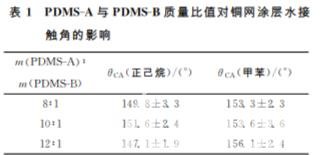 將一定質量的 PDMS、SiO2納 米 粒 子、PVDF 粉 末 與 KH-550加 入 50 mL 甲 苯 中,在 80 ℃ 下 以 600r/min的轉速機械攪拌4h,關閉加熱,在常溫下繼續攪拌1h,得到浸涂液。將長×寬為4.5cm× 4cm 的篩孔尺寸約149μm 銅網用乙醇清洗并干燥,浸入浸涂液中一段時間后以特定速度提拉成膜。樣品放入空氣中風干一段時間,再置于烘箱中固化2h,得到超疏水銅網。