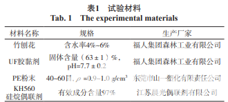 按幅面尺寸為350 mm×350 mm×14 mm,目標密 度為(660±20)kg/m3 壓制三層結構竹/塑復合刨花 板。分別稱取定量的竹刨花、UF膠和PE粉末。首先, 將竹刨花按照1:8:1 的比例分成3 份,分別用于刨花板 的上中下三層;其中,PE粉末僅在芯層添加,在添加之 前,先將質量分數(shù)為0.3%的KH560 均勻噴灑在PE粉 末上面,然后將處理后的PE粉末加入芯層竹刨花中混 合均勻,再對上中下層的竹刨花分別均勻施膠;人工分層均勻鋪裝(見圖1);預壓;在2.5 MPa的壓力條件下 熱壓成型,并靜養(yǎng)48 h;最后制備試樣。