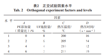 在現(xiàn)有竹材刨花板的生產(chǎn)工藝基礎上,采用L16(45 ) 正交試驗設計考察PE添加量、UF膠用量、熱壓溫度及 熱壓時間對竹/塑復合刨花板物理力學性能的影響。 L16(45 )正交試驗因素水平如表2 所示。
